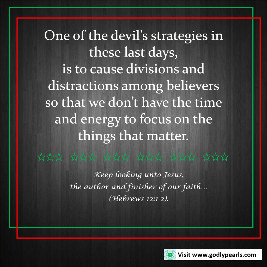 One of the devil’s strategies in these last days, is to cause divisions and distractions among believers so that we don’t have the time and energy to focus on the things that matter. The devil also attacks our faith and conviction especially as local and global leaders of faith denounce Jesus – in words and actions.